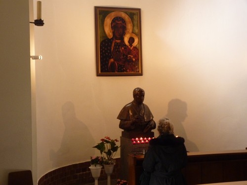 Kościół St. Marien, Flankenschanze 43, Berlin-Spandau. Obraz Matki Boskiej Częstochowskiej (autorstwa ks. Leszka Rucińskiego SDB) oraz popiersie papieża Piusa X, który, jak głosi górnośląska legenda, był ponoć Ślązakiem. |